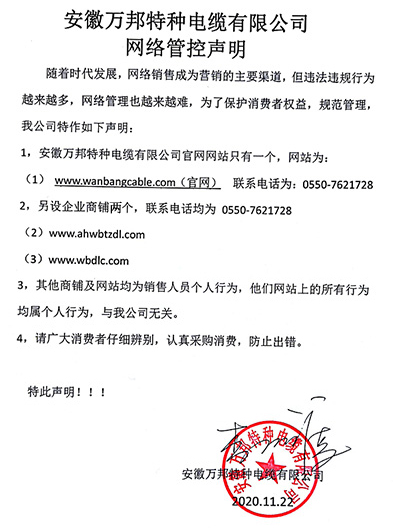 鄭重聲明:安徽萬邦特種電纜有限公司官方網站為:www_wanbangcable_com.gjbfpq.cn,除此之外無任何子網站或合作網站,其余均為假冒偽劣。電話:0550-7621728 13485756353 地 址:安徽省天長市滁州高新技術產業開發區經四路29號